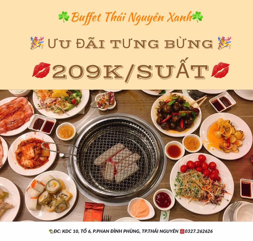 Nhà hàng Buffet Thái Nguyên Xanh là địa điểm nổi tiếng về món ăn Hàn Quốc của giới trẻ cùng những người sành ăn Thái Nguyên. Đồ ăn tại nhà hàng đều sử dụng các thực phẩm tươi ngon và giàu dinh dưỡng, cách chế biến và trình bày lúc nào cũng khéo léo, đảm bảo thỏa mãn mọi giác quan của thực khách