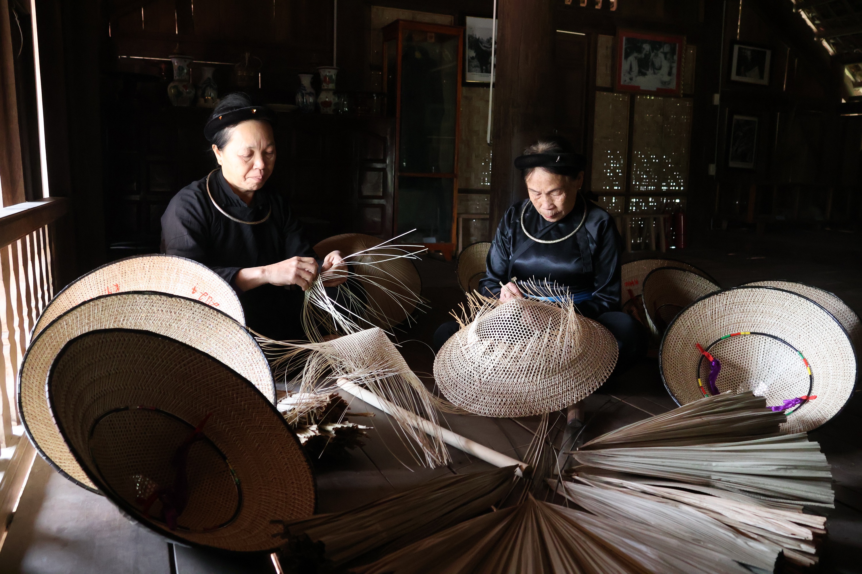 Đoàn trải nghiệm làm nón tại Làng văn hóa du lịch cộng đồng Bản Quyên.