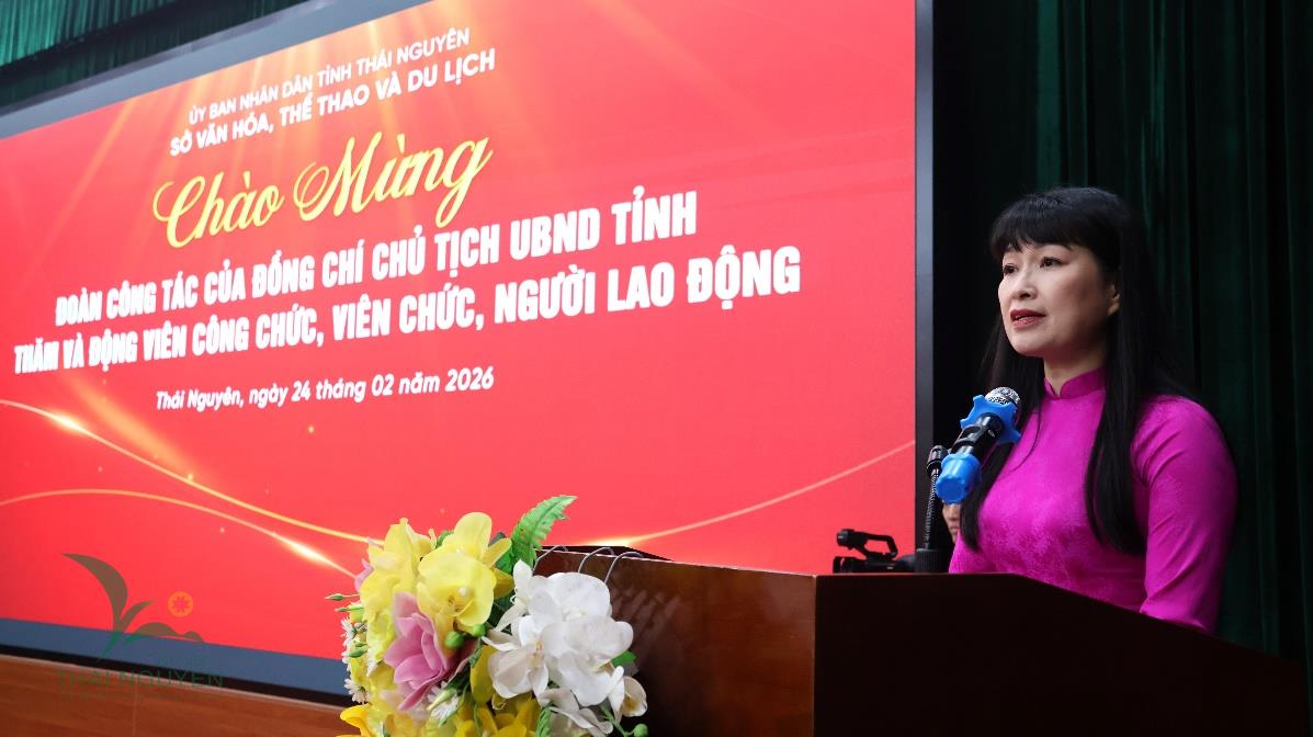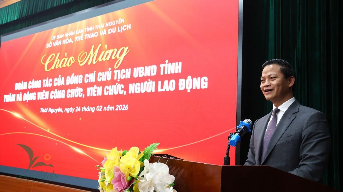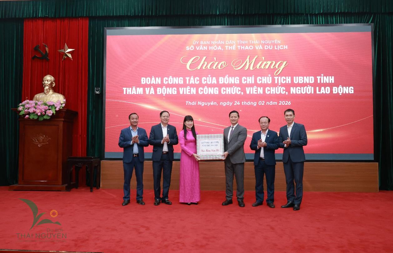 Sáng 24/02/2026, đồng chí Vương Quốc Tuấn, Ủy viên Ban Chấp hành Trung ương Đảng, Phó Bí thư Tỉnh ủy, Chủ tịch UBND tỉnh Thái Nguyên cùng đoàn công tác đã đến thăm, động viên và giao nhiệm vụ cho cán bộ, công chức, viên chức, người lao động Sở Văn hóa, Thể thao và Du lịch nhân dịp đầu xuân Bính Ngọ 2026.