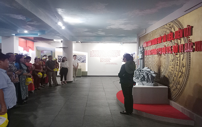Du khách nghe hướng dẫn viên giới thiệu về Khu di tích Quốc gia nơi tưởng niệm 60 cán bộ, đội viên TNXP Đại đội 915, Đội 91 Bắc Thái. Ảnh: Quang Minh