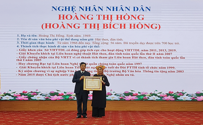 Đợt phong tặng các danh hiệu này, tỉnh Thái Nguyên có nghệ nhân Hoàng Thị Hồng, thường trú tại xã Phượng Tiến, huyện Định Hóa, được phong tặng Nghệ nhân Nhân dân ở loại hình nghệ thuật trình diễn dân gian và 6 nghệ nhân được phong tặng Nghệ nhân Ưu tú ở loại hình nghệ thuật trình diễn dân gian và tập quán xã hội, tín ngưỡng.