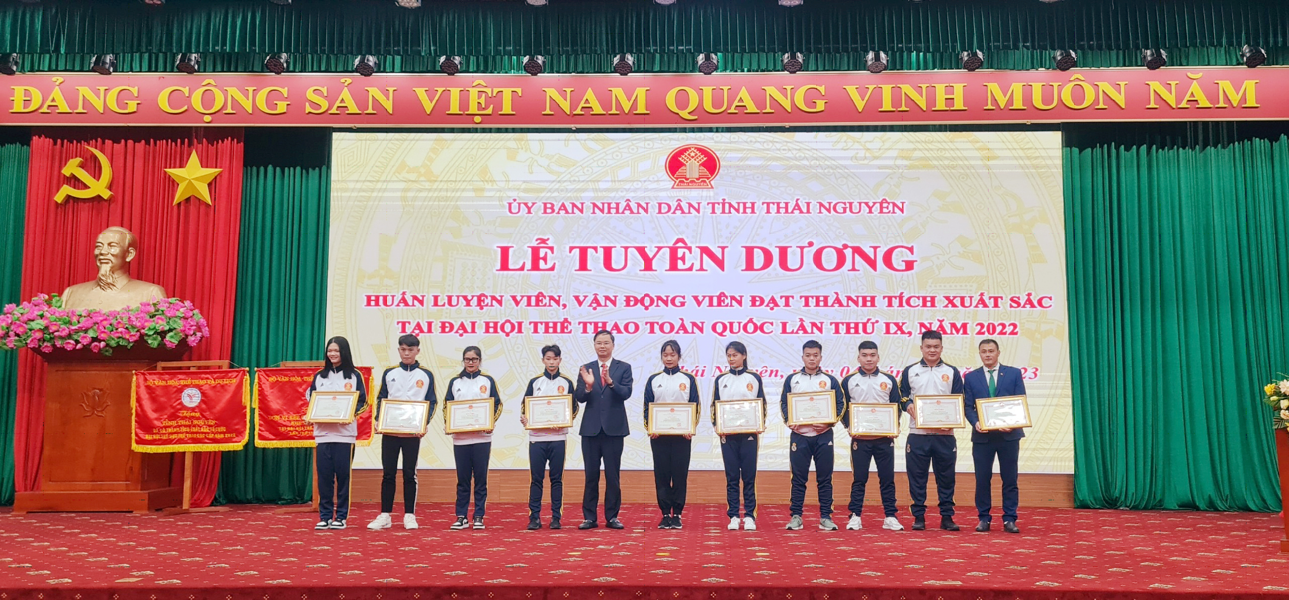 Cũng tại buổi Lễ, đồng chí Đoàn Văn Công, Phó Giám đốc Sở Văn hóa, Thể thao và Du lịch đã báo cáo công tác tham dự Đại hội thể thao toàn quốc và kết quả đạt được của Đoàn thể thao tỉnh Thái Nguyên. Đoàn thể thao tỉnh Thái Nguyên tham dự Đại hội Thể thao toàn quốc với 197 vận động viên, 34 huấn luyện viên và đã giành được 59 huy chương các loại, trong đó 18 Huy chương Vàng (đạt 150% chỉ tiêu được giao), 15 Huy chương Bạc (đạt 150%, chỉ tiêu được giao), 26 Huy chương Đồng (đạt 173,3% chỉ tiêu được giao); xếp thứ Nhất/19 tỉnh miền núi toàn quốc; xếp thứ 14/ 65 đoàn các tỉnh thành, ngành tham dự Đại hội (vượt 6 bậc so với chỉ tiêu được giao); đạt 1 cờ Nhất toàn đoàn nữ môn Kickboxing và 2 cờ Ba toàn đoàn môn Đua thuyền Canoeing và môn Muay. Với kết quả này, Đoàn thể thao Thái Nguyên đã tạo nên dấu ấn nổi bật trong thành công chung của Đại hội Thể thao toàn quốc lần thứ IX, năm 2022 và xuất sắc hoàn thành vượt chỉ tiêu kế hoạch được giao.