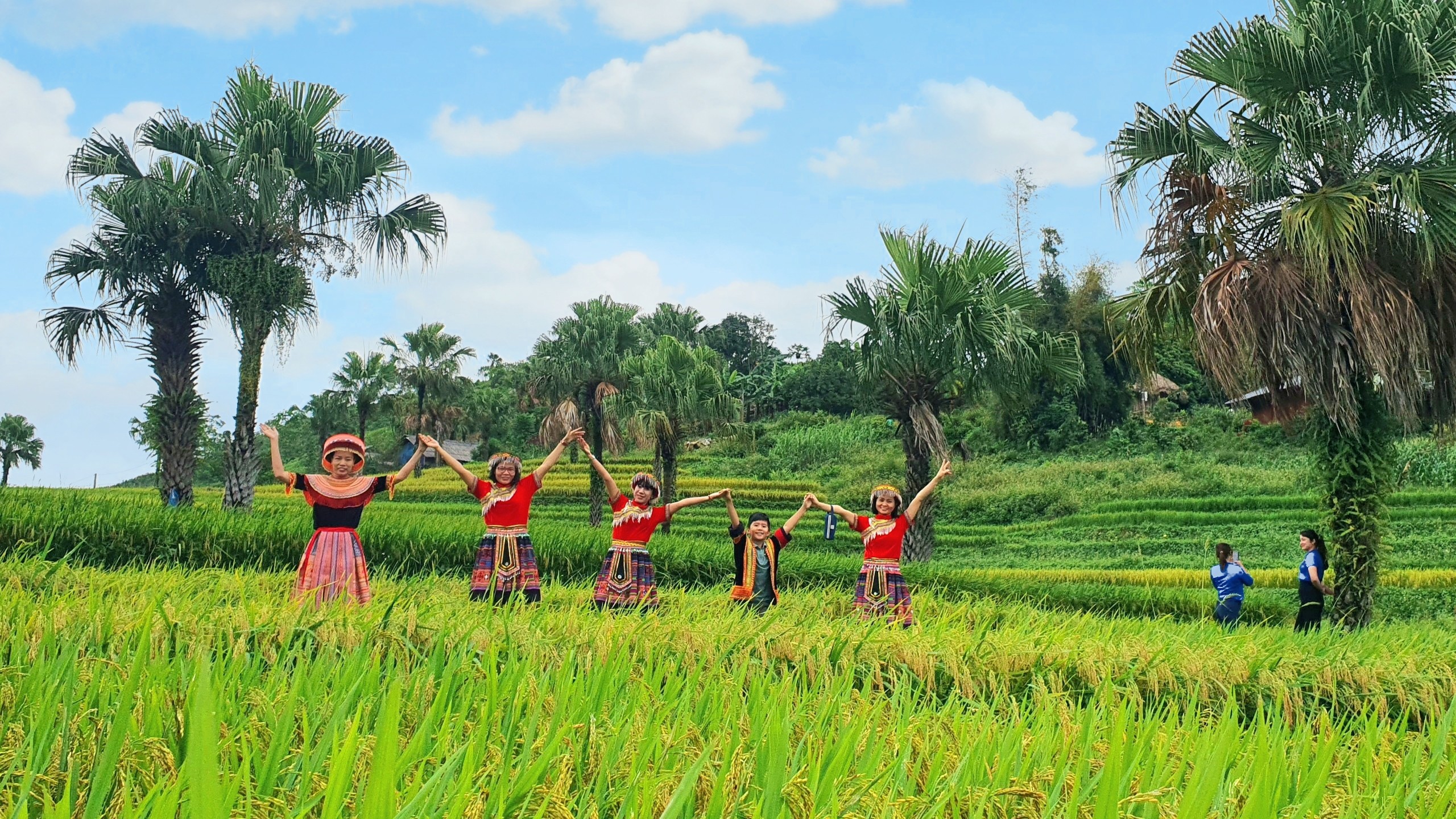 Du khách trải nghiệm, check in tại cánh đồng lúa vàng Bản Tèn.