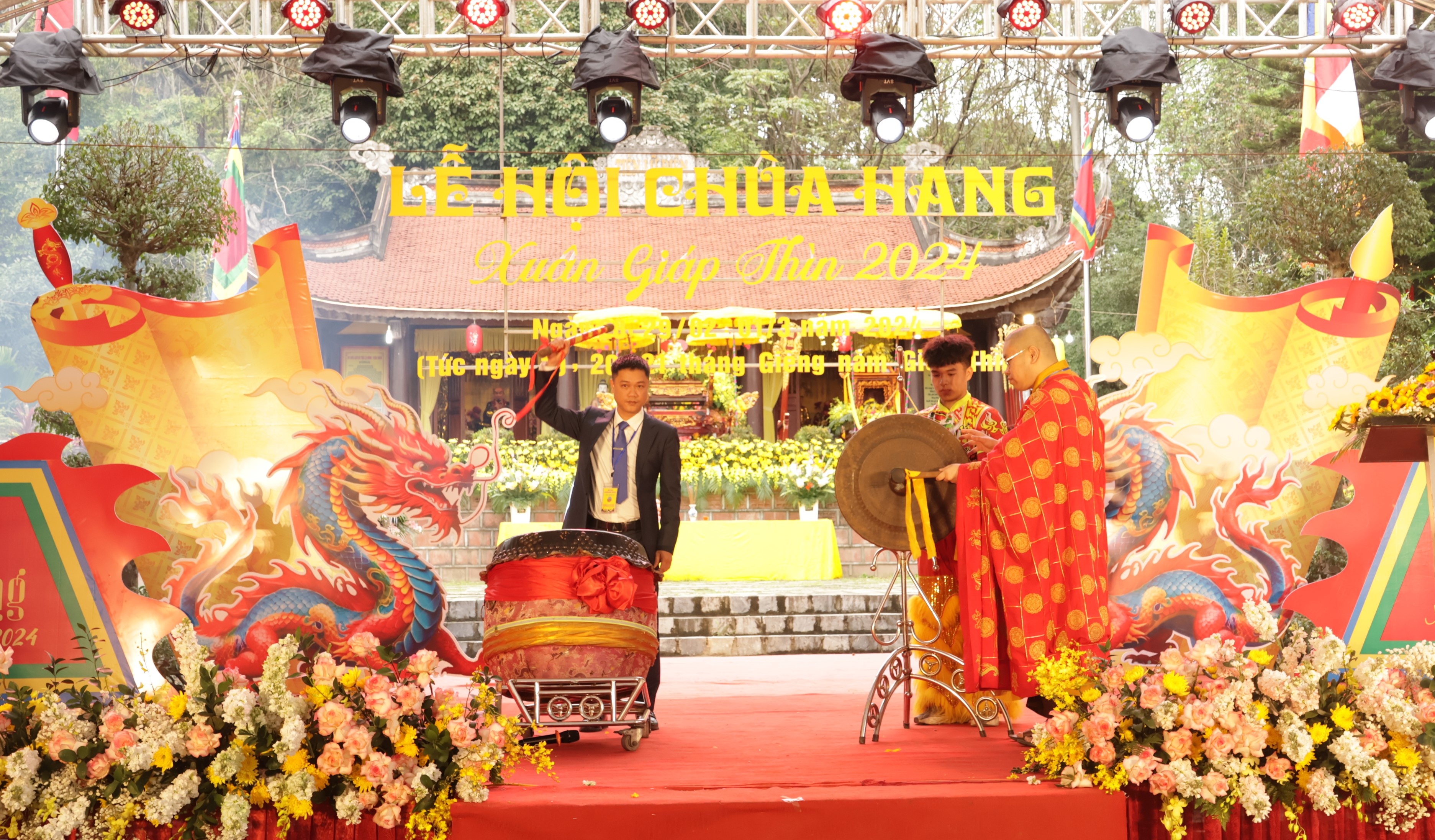 Lãnh đạo UBND phường Chùa Hang và Đại đức Thích Đức Trí, quyền trụ trì chùa Hang đánh trống và chiêng khai hội. Ảnh: Thu Hương