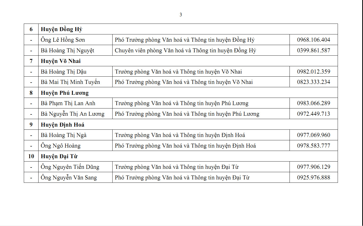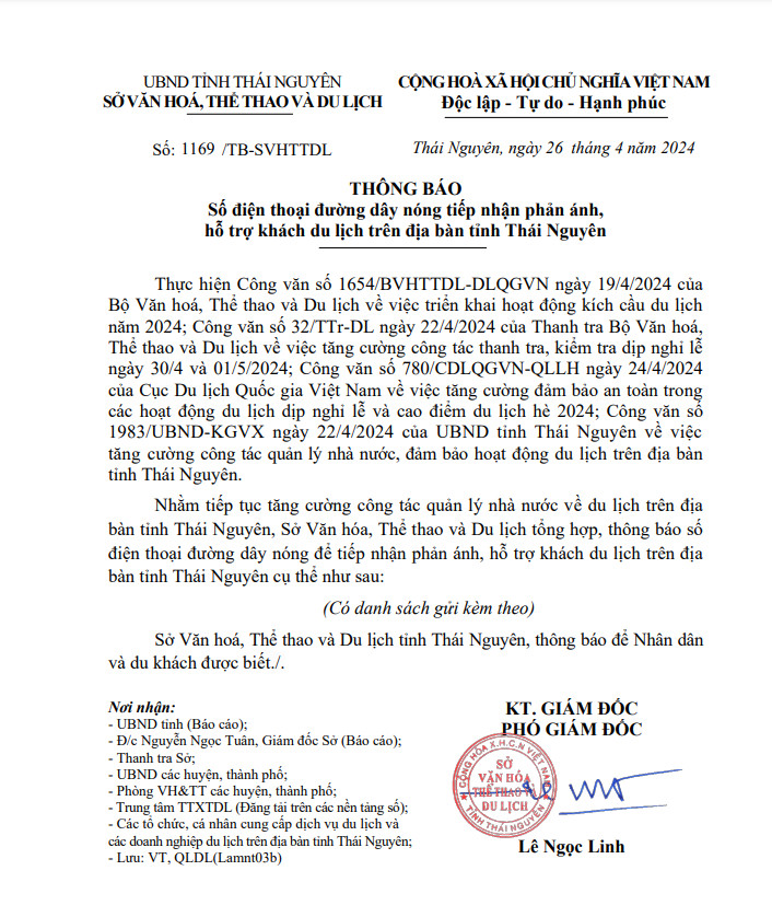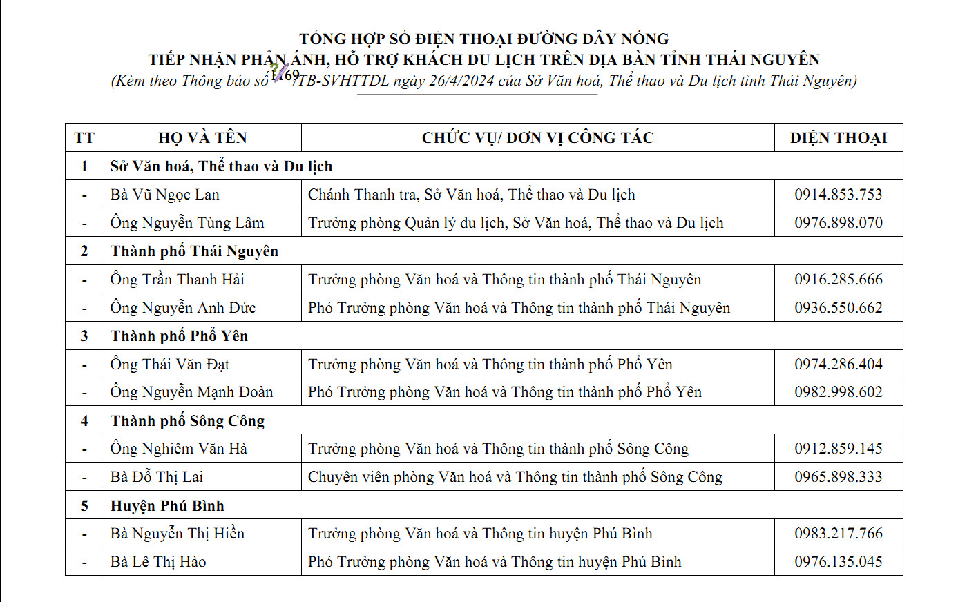 Sở Văn hóa, Thể thao và Du lịch tỉnh Thái Nguyên ban hành Thông báo số 1169/TB-SVHTTDL, ngày 26/4/2024 về việc Thông báo Số điện thoại đường dây nóng tiếp nhận phản ánh, hỗ trợ khách du lịch trên địa bàn tỉnh Thái Nguyên trong dịp nghỉ lễ ngày 30/4 và 01/5/2024.