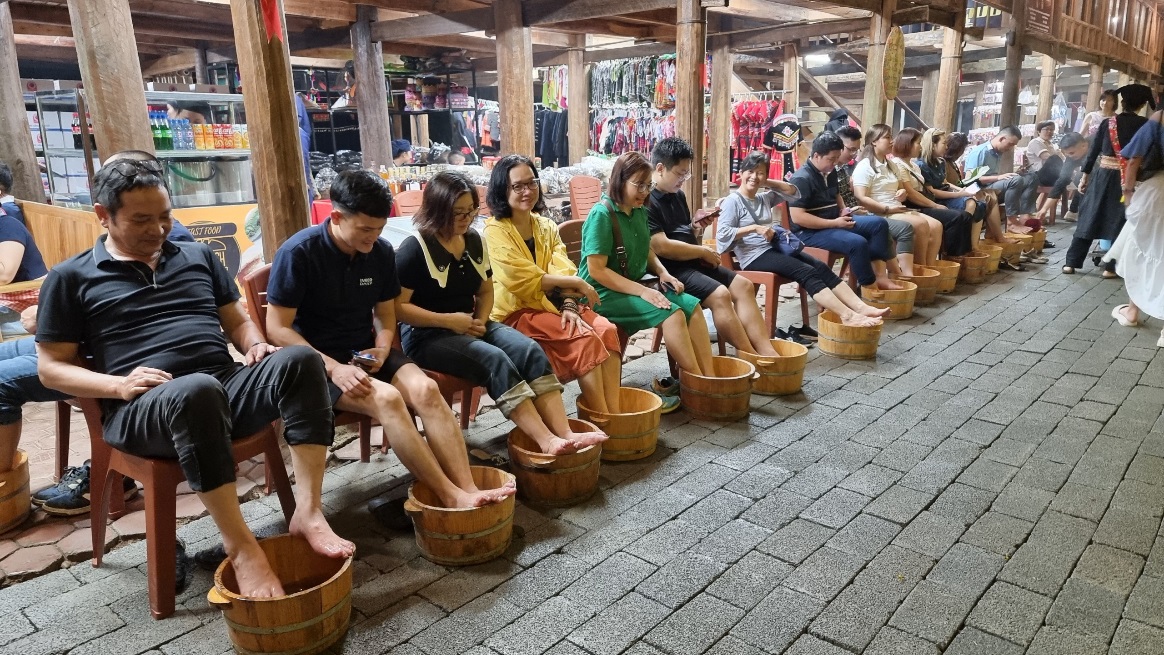 Du khách đến tham quan Bản làng sẽ được miễn phí dịch vụ ngâm chân từ các bài thuốc nam gia truyền. Ảnh: Nam Đan