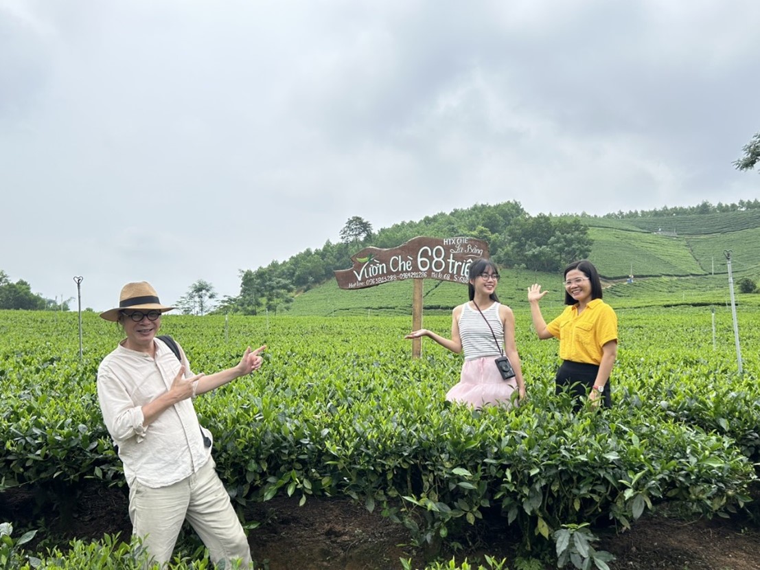 Tiếp đến, đoàn đã có những trải nghiệm khá thú vị tại vùng chè La Bằng và Điểm du lịch cộng đồng xóm Tân Sơn thuộc xã La Bằng, huyện Đại Từ. Những nương chè xanh mướt, trải dài của vùng chè La Bằng đang kỳ thu hái khiến đạo diễn Trần Lực và các thành viên trong đoàn vô cùng ấn tượng. Hòa mình cũng bà con trên những nương chè, tìm hiểu về các dòng sản phẩm trà của địa phương khiến đoàn không muốn rời đi.