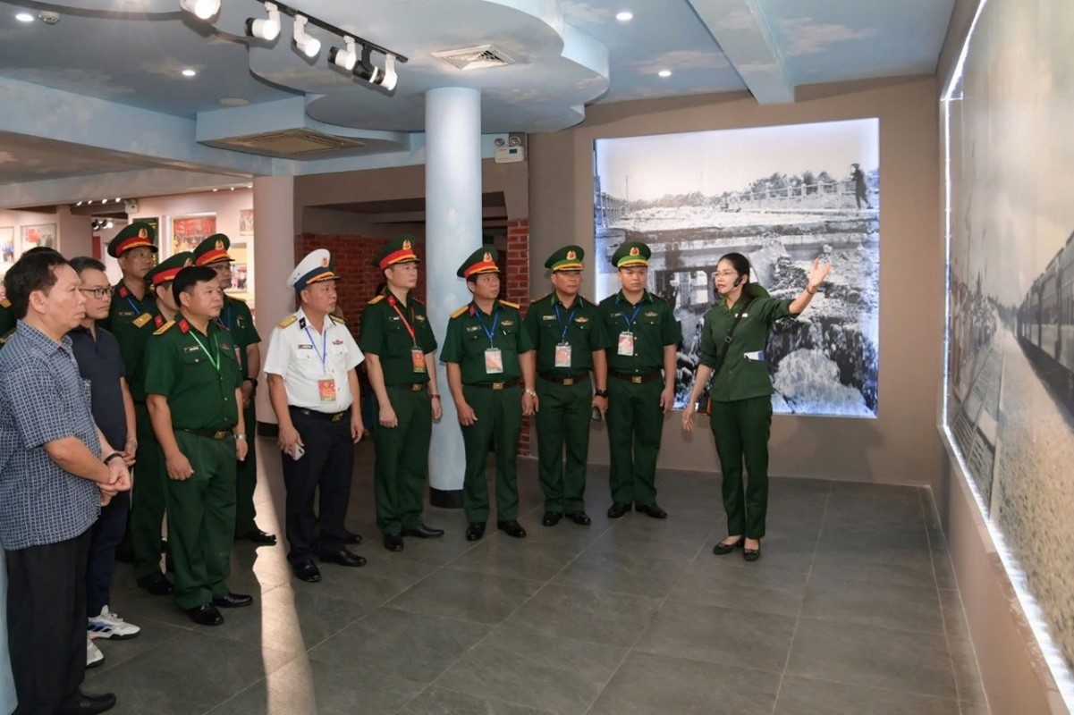 Đoàn tham quan và nghe hướng dẫn viên giới thiệu về Không gian trưng bày tài liệu, hiện vật TNXP Đại đội 915, Đội 91 Bắc Thái.