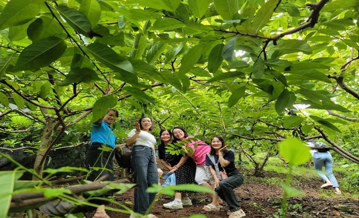 Trải nghiệm tại vườn cây ăn trái của Điểm du lịch cộng đồng xóm Mỏ Gà. Ảnh: Thu Hương