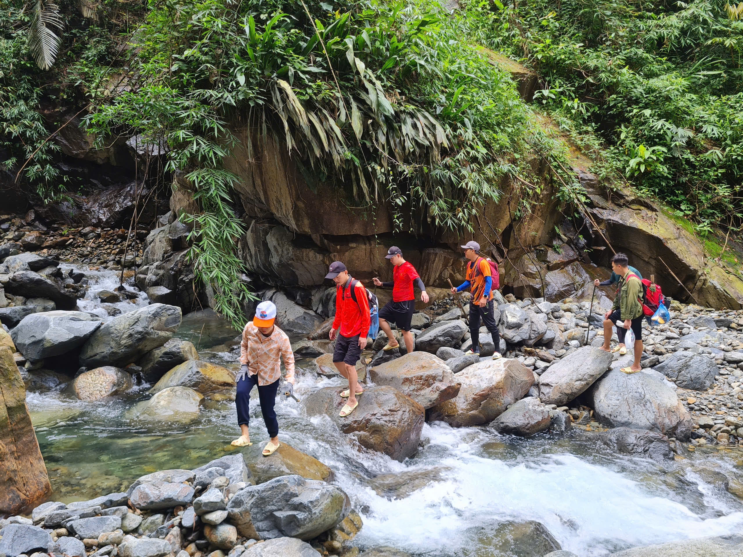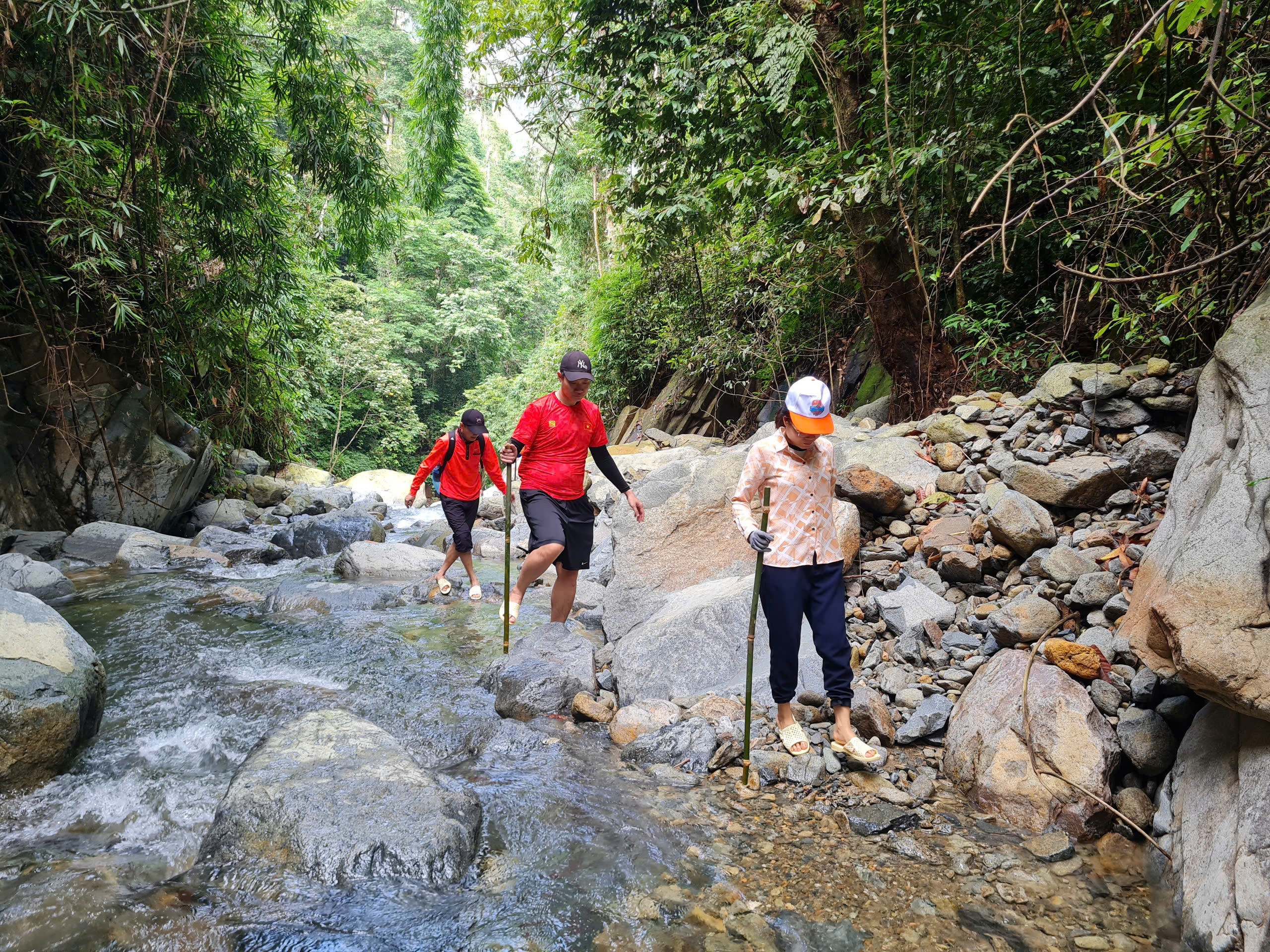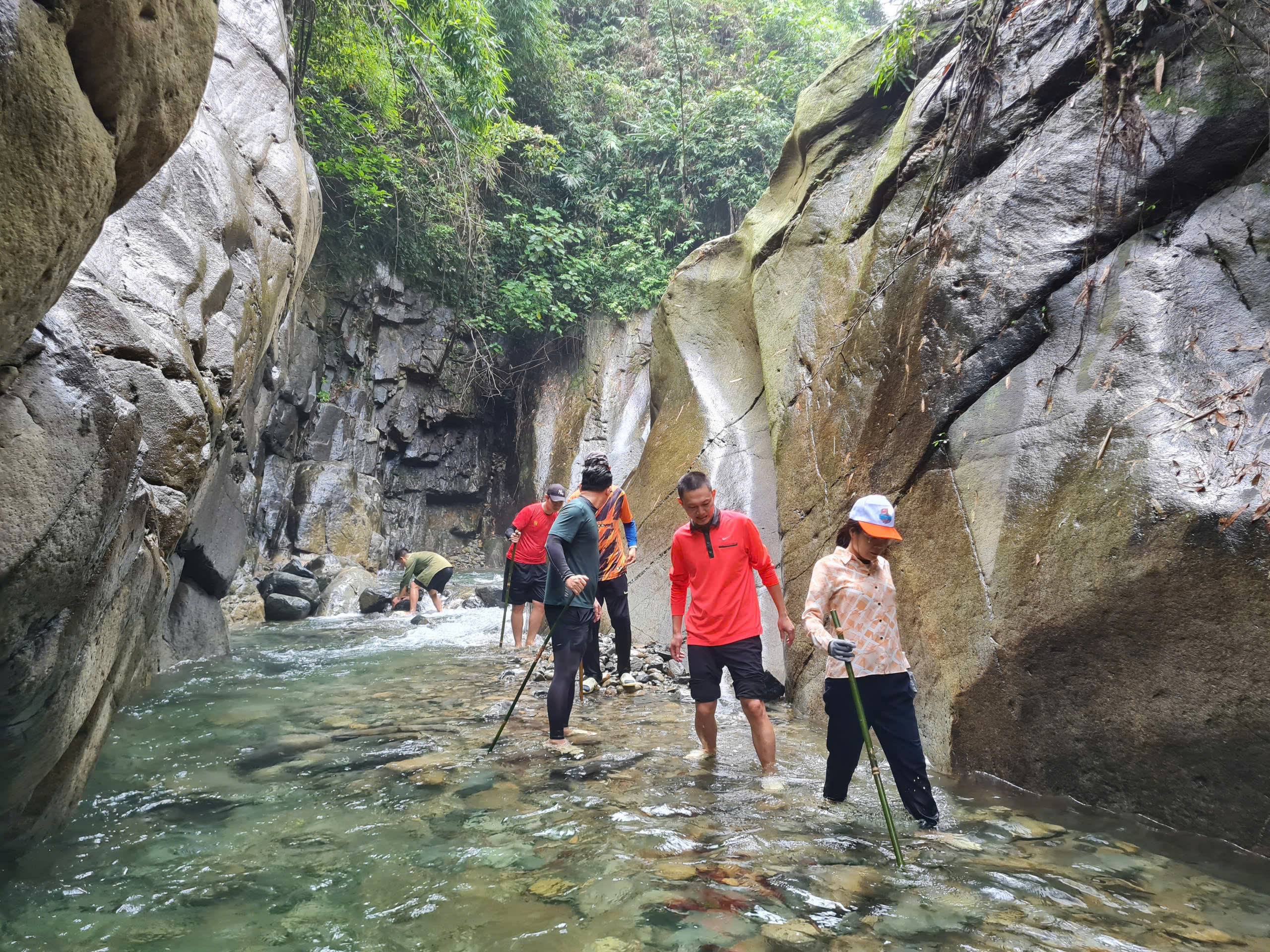 Đoàn khảo sát các cửa thác tại suối Cửa Tử. Ảnh: Nam Đan