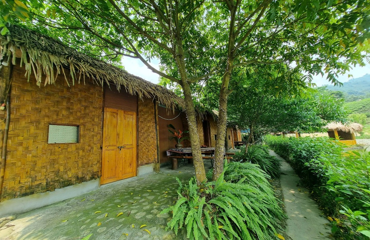 Bên cạnh lưu trú cộng đồng, cơ sở còn có 4 căn bungalow ẩn nấp trong một không gian xanh mát, ấn tượng. Mỗi căn với diện tích không quá rộng nhưng được bố trí khép kín gồm điều hòa và tiện nghi tối thiểu, có thể nghỉ từ 2 đến 4 người. Tại không gian này, cơ sở đã set up những những bộ bàn trà để mọi người có thể thưởng thức những chén trà thơm ngon của địa phương và đàm đạo những câu chuyện về nhân tình thế thái. Phía trước các căn bungalow là một không gian cực kỳ xanh mát, du khách có thể dạo bộ hoặc check in những bức hình đẹp hay thư thái thả hồn ngắm mây trời non nước nơi đây.