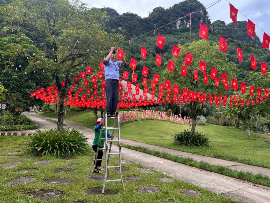 trang hoàng cờ hoa rực rỡ để chuẩn bị đón khách trong dịp lễ.