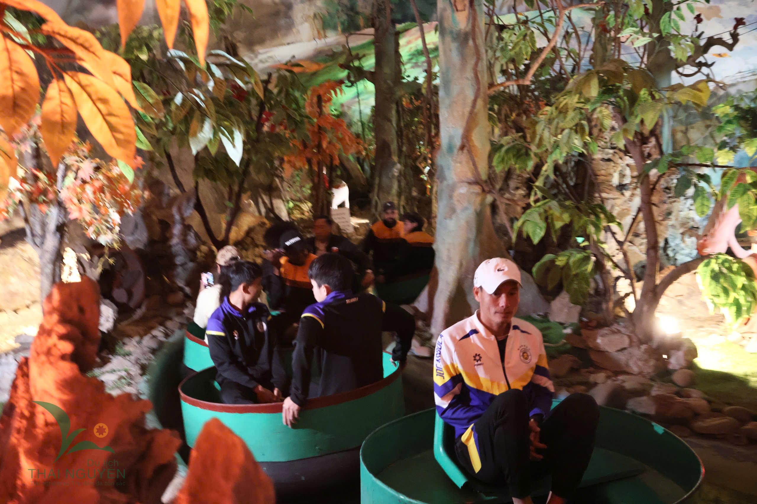 Tiếp đó, đoàn đến với Khu du lịch hồ Núi Cốc, một không gian thiên nhiên khoáng đạt, thơ mộng và đầy huyền tích. Các thành viên trong đoàn đã tham quan hệ thống hang động nhân tạo; trải nghiệm ngồi thuyền thúng trôi trên dòng sông Lười và nghe kể về sự tích huyền thoại mối tình chung thủy của chàng Cốc, nàng Công; thăm chùa Thiêng Thác Vàng - Một điểm sáng về du lịch tâm linh…Tất cả đã mang đến một cảm giác thích thú, mới mẻ cho từng thành viên trong đoàn.