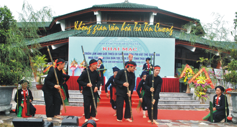 Biểu diễn múa Tắc Xình của đồng bào dân tộc Sán Chay huyện Phú Lương tại Không gian văn hóa Trà Tân Cương, thành phố Thái Nguyên.