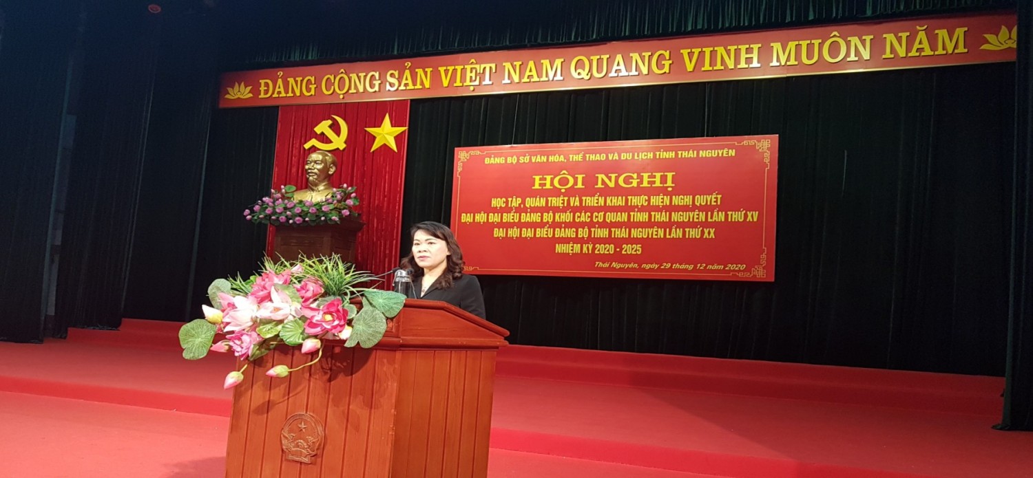 Sở Văn hóa, Thể thao và Du lịch Thái Nguyên đã tổ chức học tập, quán triệt, triển khai thực hiện Nghị quyết Đại hội đại biểu Đảng bộ Khối các cơ quan tỉnh Thái Nguyên lần thứ XV, Đại hội đại biểu Đảng bộ tỉnh Thái Nguyên lần thứ XX, nhiệm kỳ 2020 - 2025 cho toàn thể cán bộ, đảng viên, công chức, viên chức và người lao động trong toàn ngành. Đồng chí Nguyễn Thị Mai, Ủy viên BCH Đảng bộ tỉnh Thái Nguyên, Bí thư Đảng ủy, Giám đốc Sở đã trực tiếp truyền đạt Nghị quyết.