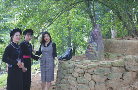 Du khách chụp ảnh kỷ niệm bên cây râm bụt Bác trồng trước mái lán Tỉn Keo, xã Phú Đình (Định Hóa).