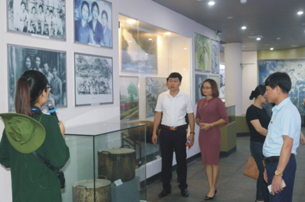 Du khách nghe hướng dẫn viên giới thiệu về các hiện vật trưng bày tại Khu di tích.