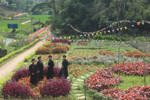Từ bàn trà đặt trước hiên ngôi nhà sàn 5 gian mái ngói, phóng mắt nhìn ra khoảnh đất phía trước, chợt thấy lòng nhẹ nhàng bởi đủ sắc hoa làm mãn nhãn. Tất cả đều do vợ chồng ông cày, cuốc, tra hạt, tưới bón. Hơn 3 năm trước vợ chồng ông đầu tư vườn cây ăn quả, gồm hơn nghìn cây, chủ yếu cam, bưởi, hồng xiêm, mít, trám đen… được trồng thành hàng lối, chỗ đất dốc tạo bậc cho khách thăm lên xuống không trượt ngã. Hiện nhiều cây trong vườn đã cho quả vụ đầu. Hai năm gần đây ông đầu tư mạnh tay hơn, gồm 1 ngôi nhà sàn 3 gian, 2 chái; toàn bộ mặt sàn phía trên dành cho các hoạt động giao lưu văn hóa, hát then, nhảy sạp, ẩm thực; đồng thời làm chỗ ngủ, nghỉ cho du khách lưu trú. Bà Lê Thị Hằng, vợ ông Khải cho biết: Mới tạo dựng cơ sở, nên mọi việc đều cần đến tiền vốn đầu tư. Đầu tháng 3 tôi vừa sắm một loạt 30 bộ chăn, ga, gối, đệm; bộ đồ nấu ăn đủ dùng cho 10 mâm cùng lúc, chỉ bấy nhiêu đã hơn trăm triệu đồng.