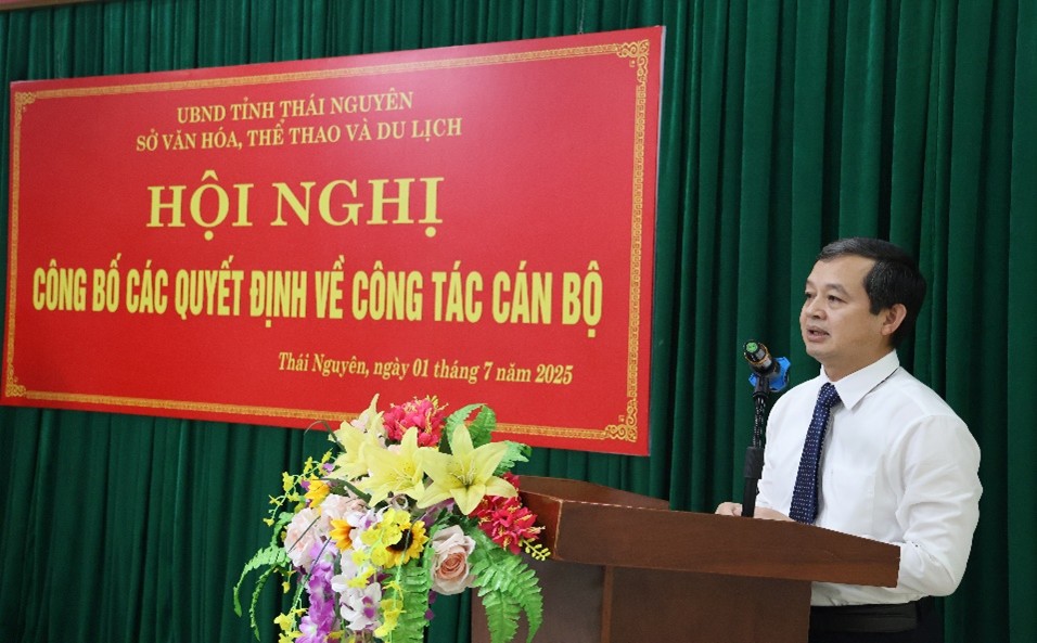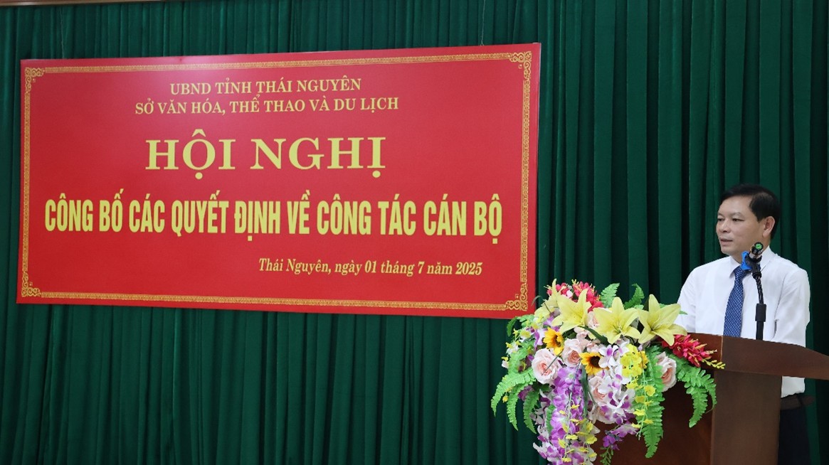 Chiều ngày 01/7, Sở Văn hóa, Thể thao và Du lịch tỉnh Thái Nguyên đã tổ chức Hội nghị công bố các quyết định về công tác cán bộ sau khi thực hiện hợp nhất 2 tỉnh Thái Nguyên - Bắc Kạn. Dự Hội nghị có đồng chí Phạm Hoàng Sơn, Phó Bí thư Tỉnh ủy, Chủ tịch UBND tỉnh; đồng chí Dương Văn Tiến, Ủy viên Ban Thường vụ Tỉnh ủy, Trưởng ban Tổ chức Tỉnh ủy; đồng chí Nguyễn Quốc Hữu, Ủy viên Ban Chấp hành đảng bộ tỉnh, Giám đốc Sở Nội vụ cùng đại diện lãnh đạo, các phòng chuyên môn và đơn vị trực thuộc Sở Văn hóa, Thể thao và Du lịch.