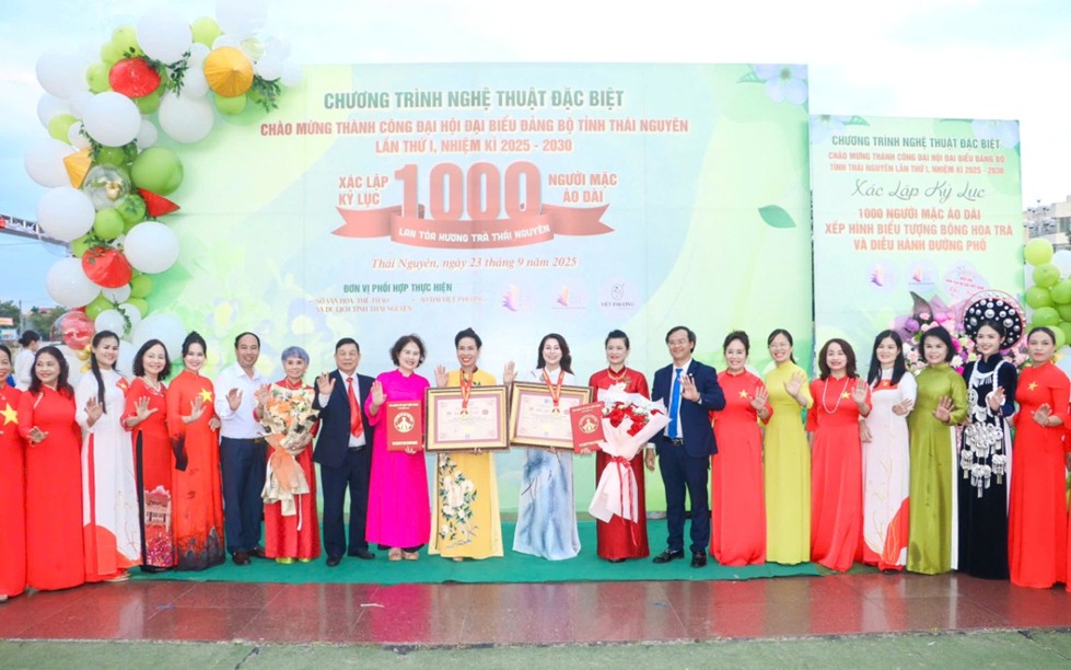 Hòa trong không khí phấn khởi chào mừng thành công Đại hội đại biểu Đảng bộ tỉnh Thái Nguyên lần thứ I, nhiệm kỳ 2025 - 2030, chiều ngày 23/9, tại Quảng trường Võ Nguyên Giáp, Sở Văn hóa, Thể thao và Du lịch phối hợp với Áo dài Việt Phượng tổ chức chương trình xác lập Kỷ lục 1.000 người mặc áo dài xếp hình bông hoa trà và diễu hành đường phố.