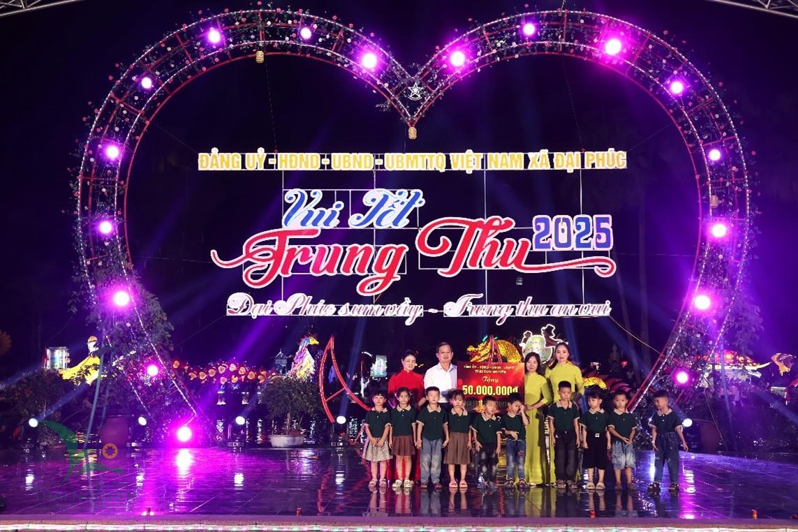 Tại Chương trình, các đại biểu và Nhân dân đã được hòa vào không khí trung thu sôi động với các tiết mục văn nghệ đặc sắc; diễn diễu các mô hình đèn trung thu đa dạng, sáng tạo, mang tính nghệ thuật cao của các địa phương trong xã và cùng phá cỗ trông trăng trong đêm hội trăng rằm ấm áp và ý nghĩa. Cũng trong chương trình, các đồng chí lãnh đạo tỉnh, lãnh đạo xã Đại Phúc và các đơn vị tài trợ đã trao tặng phần quà trị giá 50 triệu đồng cho Trường Mầm non Phúc Tân và 15 suất quà Trung thu cho các em thiếu nhi có hoàn cảnh đặc biệt khó khăn trên địa bàn xã.